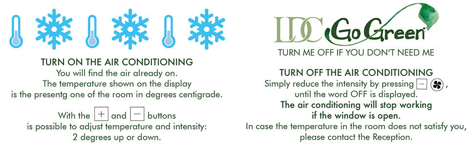 Troverete l’aria già accesa al vostro arrivo. La temperatura mostrata sul display è quella attuale della camera in gradi centigradi. Premendo i tasti + e – è possibile regolare di due gradi la temperatura e l’intensità.